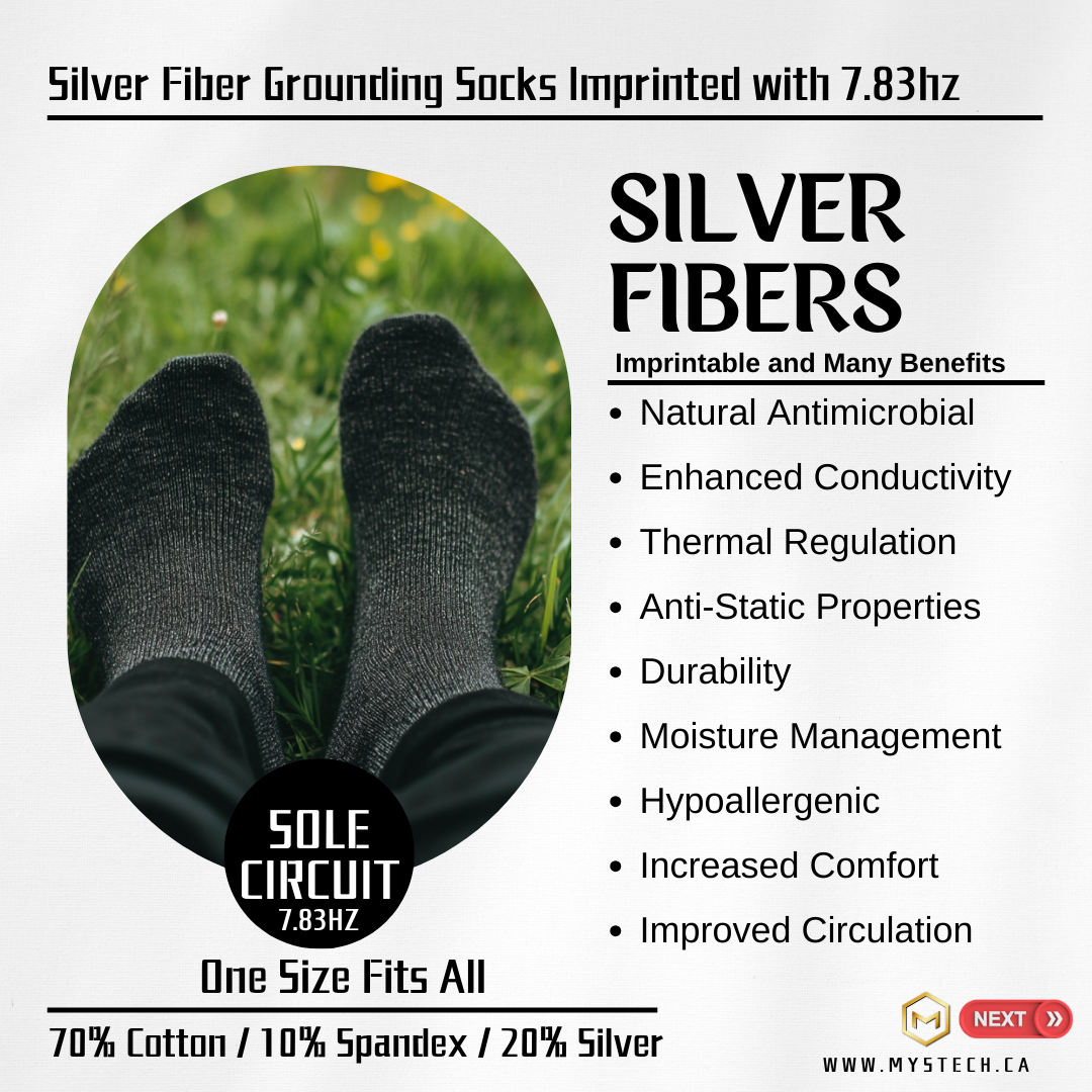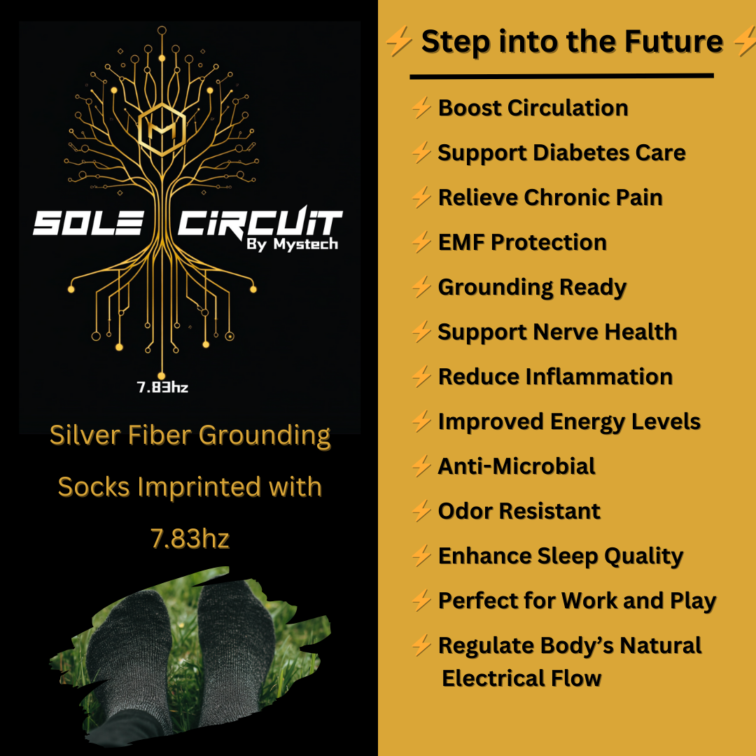 Looking for a way to stay connected and grounded throughout the day? Introducing Sole Circuit Grounding Socks—designed to harness the healing power of silver fibers and the natural alignment of 7.83Hz Schumann Resonance. These socks were created to offer the best of both worlds: the proven benefits of silver’s antimicrobial and healing properties, and the Schumann Resonance frequencyfor enhanced mental clarity, balance, and calm. Perfect for those who cannot wear jewelry at work or the gym, these were designed with convenience in mind.